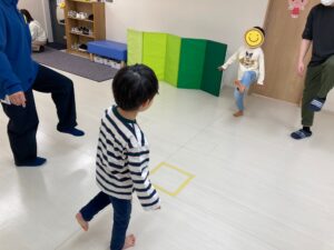 先生の合図や音楽の変化に合わせて、「止まる」「手を叩く」「しゃがむ」など、指示に応じた動きを取り入れています。