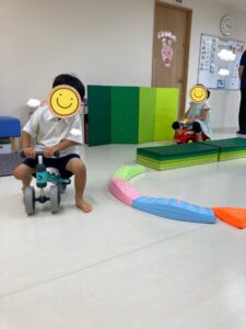 みんなで乗り物に乗って、追いかけっこや競争を楽しんで元気いっぱいです。